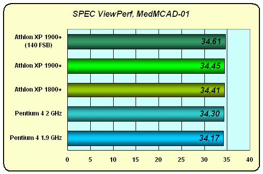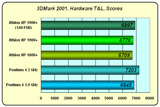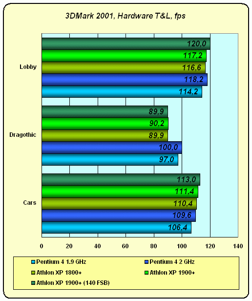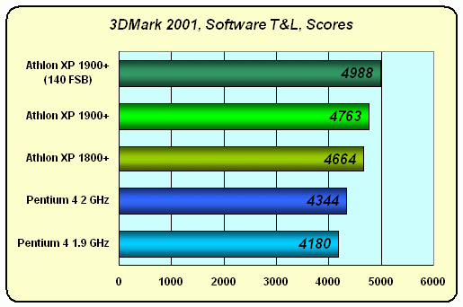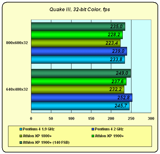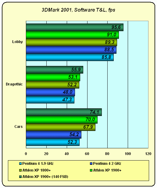 Athlon XP 1900+ в двух подтестах идет с Pentium 4 наравне, и чуть-чуть проигрывает в третьем. К сожалению, в этот раз мы не успели проверить свою основную рабочую гипотезу (напомним — она состоит в том, что хорошими результатами в этом тесте Pentium 4 обязан оптимизации драйверов NVIDIA Detonator под дополнительный набор инструкций Pentium 4 SSE2). Однако сделать это теперь не составляет особого труда т.к. на рынке появился еще один неплохой и быстрый OpenGL-акселератор — ATI Radeon 8500. Поэтому пока лишь констатируем выигрыш Pentium 4 в общем зачете, как говорится, "до выяснения подробностей" :)