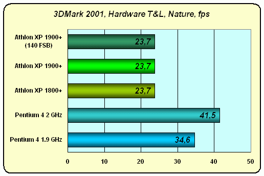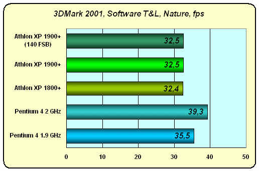 Кое-где больше, кое-где меньше, а в целом — примерное равенство. На этом можно было бы и закончить, если бы не явно выбивающиеся из общего ряда результаты в тесте Nature с Software T&L и Hardware T&L. Да, и там и там Pentium 4 выигрывает, но насколько по-разному! И уж совсем непонятно, почему эта разница больше в том случае, когда по идее она должна быть меньше — при задействовании аппаратного T&L-блока видеокарты!