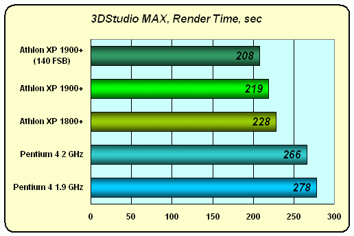 Мы уже заранее предупредили, что не собираемся "расписываться" в этом материале, поскольку концептуально он мало чем отличается от предыдущего на сходную тематику. В программе 3DStudio MAX AMD Athlon традиционно и стабильно обгоняет Pentium 4, причем для того чтобы обогнать Pentium 4 2 GHz даже не понадобился бы Athlon XP 1900+ :) Еще один пример программы, явно предрасположенной к традиционной архитектуре процессорного ядра. Если производитель не переделает ядро рендерингового механизма этого приложения с нуля, подозреваем, что Pentium 4 на нем и далее "не жилец" :)