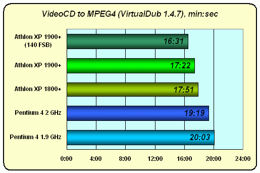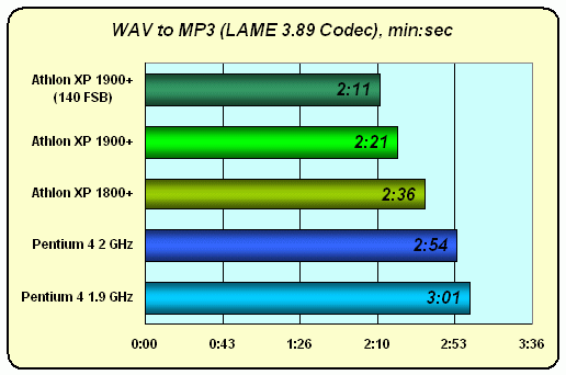 Любимый тест Intel :) И любимый заслуженно — никогда не возникало ситуации, чтобы верхний по частоте Pentium 4 в этом тесте не "уделал" все остальные процессоры. Именно так произошло и в этот раз. Но все же Athlon XP 1900+ подобрался близко. Очень близко.