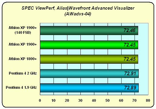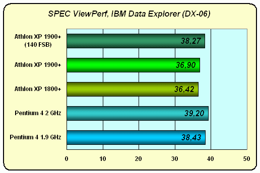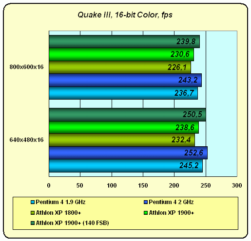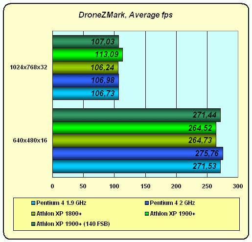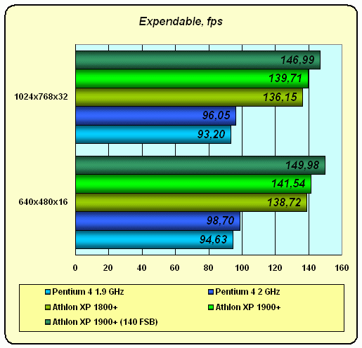 Довольно интересный тест, хоть и нагружает он в основном видеосистему, и довольно интересные результаты. Обратите внимание на равный результат Athlon XP 1800+ и Athlon XP 1900+ при штатной частоте FSB, и вырывающийся вперед Athlon XP 1900+ работающий в разогнанном режиме на частоте FSB 140 MHz. Как нам кажется, вывод лежит на поверхности: для того чтобы догнать Pentium 4, системам на базе процессоров AMD в данном тесте явно не хватает скорости магистрали процессор <--> память.