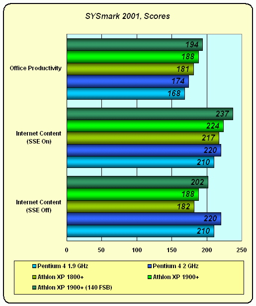 "Мануально полеченный" нами с целью корректного распознавания поддержки SSE на Athlon XP. И результат не замедлил сказаться — убедительный выигрыш у Pentium 4, у которого этот тест ранее также числился в разряде "любимчиков". Пожалуй, это и будет основным выводом из результатов SYSmark 2001: Athlon XP (и вообще все процессоры на ядрах Palomino и Morgan) явно очень многое приобрели от того, что в них добавили поддержку SSE. Немножко подначим фанов AMD: поддержку дополнительного набора инструкций от Intel :)