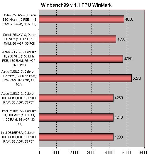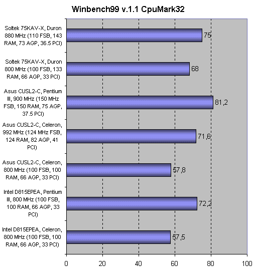 Как видно из теста Winbench, при разгоне практически по прямой растет скорость сопроцессора, а прирост в скорости процессора менее заметен, и даже при большей тактовой частоте у Celeron'а нет того выигрыша в скорости у процессоров Pentium и Duron. Видимо, тут оказывает влияние вдвое меньший кэш в первом случае и другая организация его у Duron'а, но этого можно было ожидать.
