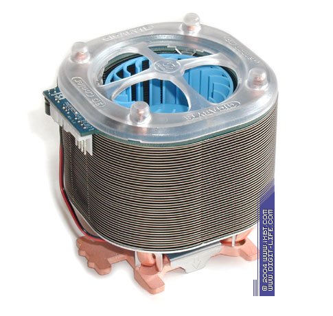 Возможно, это прозвучит высокопарно, но наш подопечный PCU21-VG относится как раз к тому крайне малочисленному классу систем охлаждения, представители которого сходу (и очень цепко) приковывают взор. Здесь есть на что взглянуть и чему подивиться! Новаторская конструкция радиатора, составленного из четырех медных тепловых трубок диаметра 6 мм и секции алюминиевых теплорассеивающих пластин толщиной 0,4 мм (в количестве 43 штук!), а также внушительный центробежный вентилятор типоразмера 80х60 мм не могут оставить равнодушными даже заядлых скептиков!