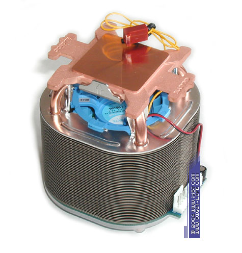 Бесспорно, главнейшей достопримечательностью PCU21-VG является весьма занимательная комбинация двух технологических изысков тепловых трубок и центробежного вентилятора. Вообще говоря, история применения и первого, и второго изысков в системах охлаждения ПК насчитывает уже много лет. Но такая идеология, по типу «бури в стакане», где ответственную роль «бури» исполняет центробежный вентилятор, а в качестве «стакана» выступает секция пластин, закрепленных на теплоотдающей части трубок, не встречалась еще нигде! Вдвойне интересно, что эта идеология, помимо привлекательной новизны (последняя, кстати, далеко не всегда дает осязаемый результат), несет в себе также и глубокий технический смысл. А именно позволяет устранить сразу два взаимосвязанных недостатка, свойственных типическим конфигурациям на базе тепловых трубок, коими являются крупные габариты и не особенно высокая тепловая эффективность.