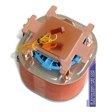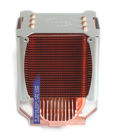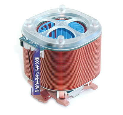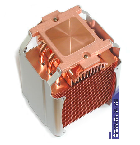 Чисто визуально «новичок» 3D Cooler-Ultra наследует все фамильные черты своего прародителя 3D Cooler-Pro и предлагает такое же новаторское содружество тепловых трубок и «стакана» теплорассеивающих пластин, облагороженное мощным центробежным вентилятором 80х60 мм. Нововведением можно посчитать здесь разве что только замену алюминия на медь: оребрение теплоотдающей части радиатора теперь образовано секцией медных пластин толщиной 0,3 мм в количестве 44 штук. Общее идейное наполнение кулера остается прежним.