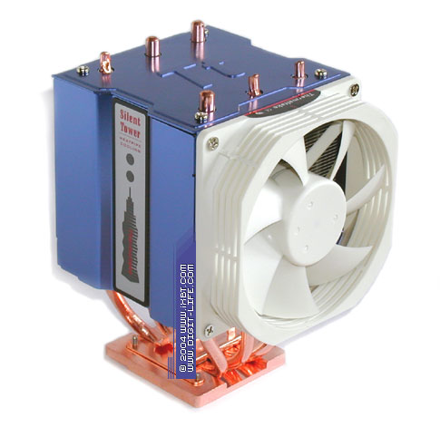 Торс у Silent Tower, надо отметить, действительно исполинский, без преувеличений. Тут он даже обходит гиганта Hyper 6: мощный радиатор 86х80х138 мм, объединяющий три медных тепловых трубки диаметра 6 мм и секцию алюминиевых теплорассеивающих пластин толщиной 0,2 мм в количестве 59 штук, а также укрупненный вентилятор типоразмера 90х90х25 мм смотрятся очень внушительно и авторитетно.
