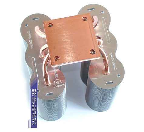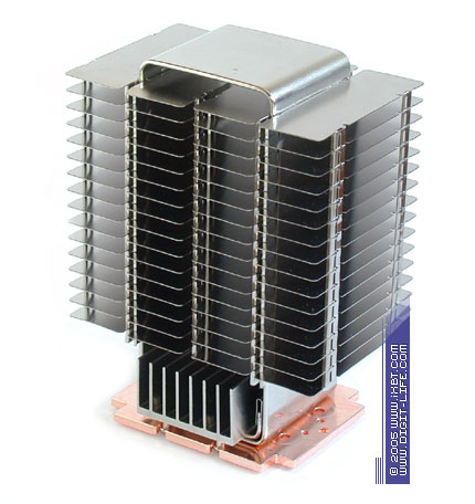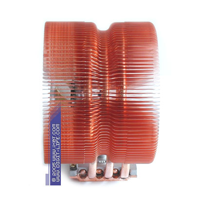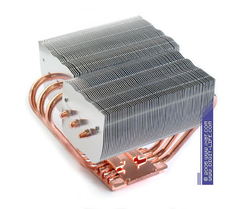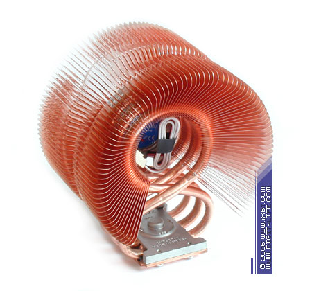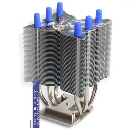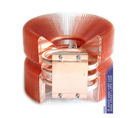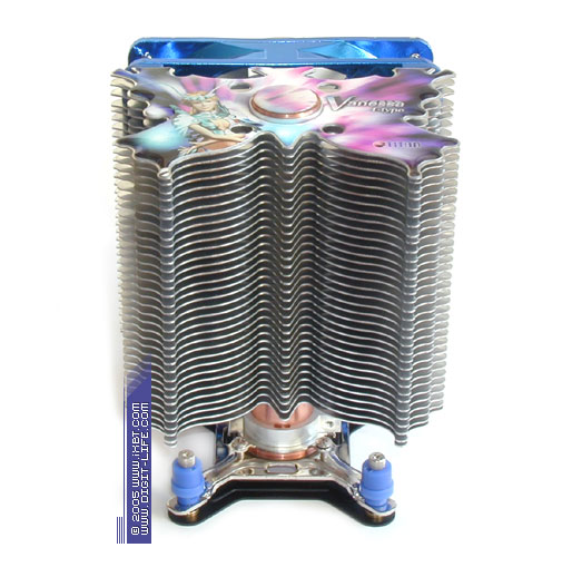 Генеральная изюминка Vanessa L-type это радиатор своеобразного конструктива, базисом (или лучше даже сказать «становым хребтом») которого, вместо «стандартного» набора тепловых микротрубок, выступает гигантская тепловая труба диаметра 25 мм. Идея безоговорочно оригинальная и заслуживающая самого пристального внимания! Действительно, такая конфигурация позволяет просто и эффектно разрешить сразу две проблемы. Во-первых, одна полногабаритная тепловая труба легко может дать фору доброму десятку микротруб по энергоемкости и интенсивности теплопереноса обладая более продвинутыми характеристиками, она намного эффективнее справляется со своими теплотранспортными обязанностями. Ну, а во-вторых, эта труба напрямую контактирует с процессором то есть, делает излишним присутствие в конструктиве радиатора специализированного теплосъемника и тем самым позволяет исключить побочные потери на теплообменном пути процессор-среда. Что ж, спецов Titan можно поздравить с рождением нового богатыря после долгой череды скучных и невыразительных продуктов им наконец-то удалось сваять что-то по-настоящему интересное и примечательное!