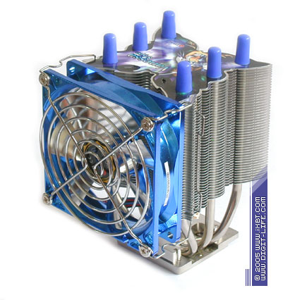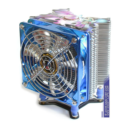 Первейшая достопримечательность Big Typhoon это термически подкованный радиатор 122х122х100 мм, «рабочее тело» которого составляют 6 медных тепловых трубок диаметра 6 мм и две секции алюминиевых пластин толщиной 0,2 мм с шагом размещения 1 мм (по 70 шт в каждой секции), развернутые в горизонтальной плоскости параллельно подошве, образованной медным теплосъемником 50х50х8 мм. Хорошее впечатление производит также набортный вентилятор типоразмера 120х120х25 мм, выявляющий вполне пристойное техническое качество вкупе со сбалансированной расходной характеристикой (номинальная скорость вращения крыльчатки 1300 об/мин). К тому же, благодаря своей горизонтальной диспозиции, он может обеспечить не только продув оребрения, но и активную конвекцию в зоне теплосъемника, дополнительно разгружая наиболее интенсивно прогреваемые участки тепловых трубок. Нельзя обойти вниманием и высокоразвитую площадь поверхности теплообмена, которая у Big Typhoon насчитывает порядка 7000 см², чем достойна всемерного поощрения, особенно если учесть довольно компактный профиль секций оребрения (характерный размер пластин 55х45 мм).