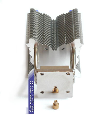 Отдельные нарекания вызывает и сама конфигурация оребрения здешняя секция пластин (толщина 0,7 мм, шаг размещения 3 мм, общее количество 34 штуки), при своих исполинских габаритах 130х85х115 мм, в части площади поверхности теплосброса еле дотягивает до величины 4000 см². На память сразу приходит меткое выражение главного персонажа одного известного мультфильма: «Маловато будет!». Особенно для радиатора такого конструктива! Ведь совершенно очевидно, что если использовать более тонкий техпроцесс производства пластин (скажем, с выходной толщиной 0,3-0,4 мм), в имеющемся объеме можно было бы спокойно развить намного большую площадь поверхности теплообмена, причем без ущерба для гидравлических и массовых параметров радиатора, с обеспечением избыточной минимизации термического сопротивления. Ну, тут уж, как говорится, что имеем, то и имеем.