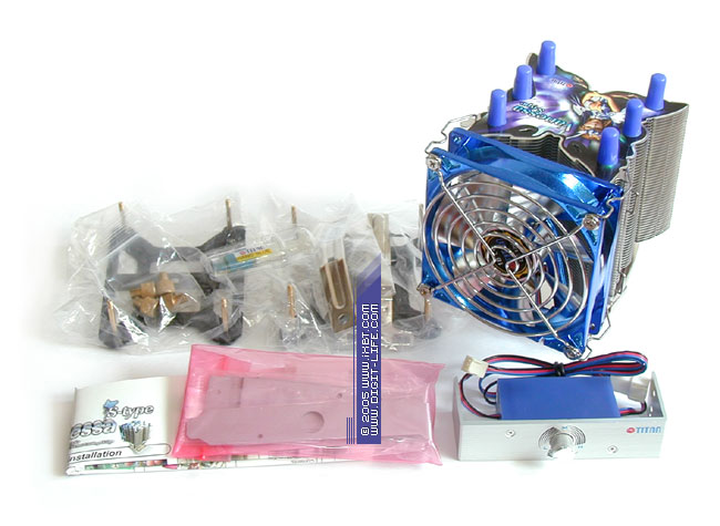 Прочие эксплуатационные элементы кулера смотрятся не менее привлекательно в поставке Vanessa S-type дополнительно прилагаются: симпатичный вентилятор типоразмера 92х92х25 мм (номинальная скорость вращения крыльчатки 2400 об/мин), регулятор-потенциометр, комплект монтажных планок для регулятора-потенциометра, термопаста и техническое руководство с русскоязычной инструкцией.