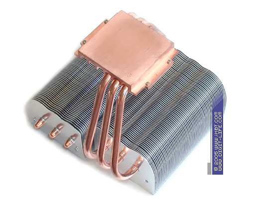 Шутки шутками, но даже если полностью подчистить внешний лоск, издавна присущий продуктам Zalman, «новичка» CNPS9500 LED можно смело назвать произведением искусства настолько лихо и хитроумно тут все закручено, что удержаться от определений в превосходной степени относительно его качеств никак не получится. Конструктив радиатора CNPS9500 LED действительно выдающийся! И первейшего внимания здесь заслуживает технически изящная реализация теплотранспорта, в роли которого выступает группа из 3 тепловых трубок диаметра 6 мм, по термическому потенциалу эквивалентных комбинации 6 тепловых трубок: благодаря оригинальному изгибу форм (что-то вроде сплющенной восьмерки), трубки размещены так, что образуют 6 участков термоконтакта с теплосъемником и 3 протяженных элемента теплосброса, обеспечивая оптимизированные условия приема и передачи тепла к оребрению.