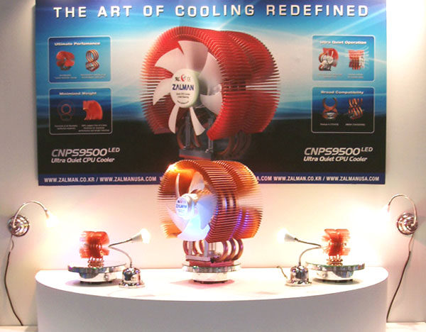 К слову, первая презентация CNPS9500 LED, прошедшая летом этого года в рамках выставки Computex 2005, произвела самый настоящий фурор, став центральным событием в секторе систем охлаждения. Компания Zalman к тому времени уже давно обещала рассекретить новое высокотехнологичное чудо, и сдержала свои обещания то, что удалось узреть посетителям, явилось для них истинно сенсационным откровением: «гвоздем программы» выступил гигантский, почти полуметровых габаритов, функциональный макет кулера, сходу покоривший сердца компьютерных энтузиастов. И надо отметить, нашлось немало веселых и находчивых ребят они с полной серьезностью интересовались, когда же все-таки будет доступен соответствующий корпус, способный воспринять сие божественное творение, и после уклончивых ответов от спецов Zalman, терпеливо ожидали раздачи «сувениров» «миниатюрных копий», расставленных вокруг внушительного «Большого брата». :)