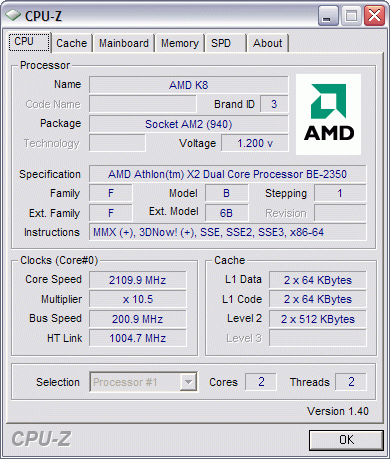 Таким образом, Athlon X2 BE-2350 — это двухъядерный Athlon среднего класса, с низким энергопотреблением, второго «семейства», и с индексом производительности 350. Пока это самый высокий индекс в данной линейке.