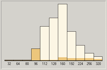 В общем-то, ничего особенного. Вполне вписывается в наши гипотезы. Для справки (и чтобы вы не подумали, что наши выводы относительно специфики работы параметра V в кодеке LAME чисто умозрительны) мы приведем гистограммы кодирования MP3 с переменным битрейтом для большого диапазона и разного качества VBR (благо, RazorLame выводит их в весьма понятной и доступной форме). Четко видно, как меняется «весовой состав битрейтов» в итоговом MP3 при сохранении одного и того же диапазона, но разном значении параметра V.