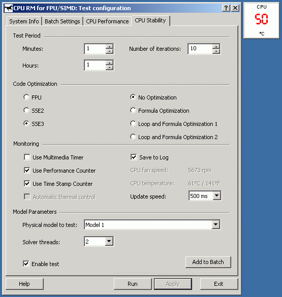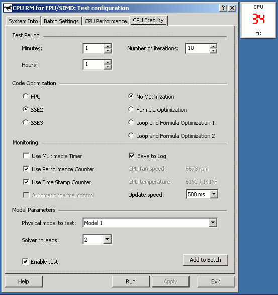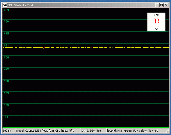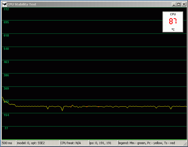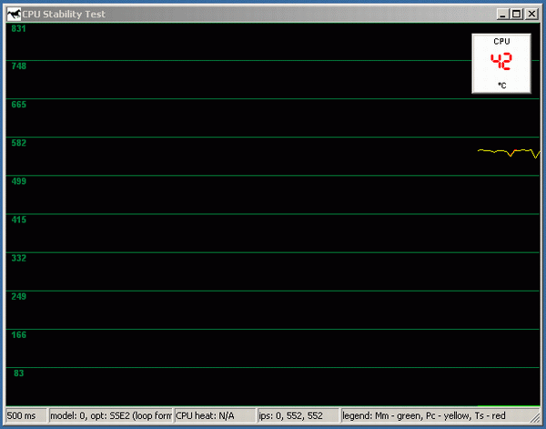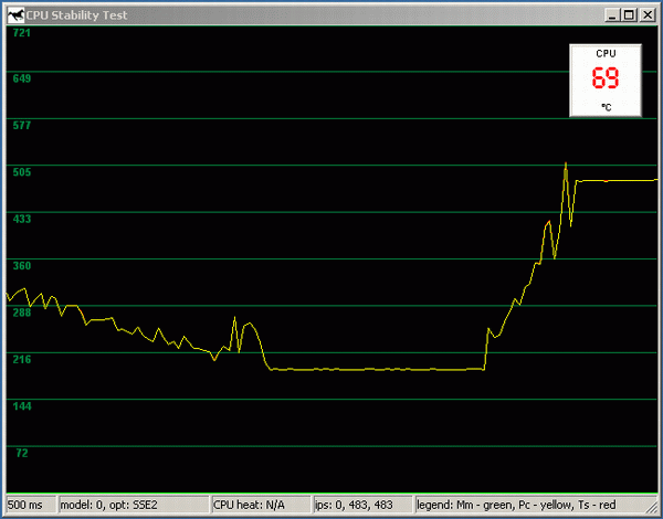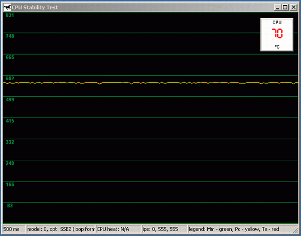 Для достижения 100% загрузки процессора (точнее, обоих виртуальных CPU, т.к. использованные нами Pentium 4 поддерживают технологию Hyper-Threading), использовался подтест CPU Stability из последней версии тестового пакета CPU RightMark т.к. он позволяет динамически отслеживать производительность процессора. Напомним, что частота работы ядра у Pentium 4 при включении Thermal Throttling не меняется , поэтому отслеживать следует именно производительность! Для измерения температуры, дабы не мудрствовать лукаво, и не завязываться на утилиты от конкретных изготовителей системных плат, была использована достаточно популярная программа Motherboard Monitor версии 5.3.6.0, окно которой («Dashboard», пользуясь терминологией авторов) было выведено рядом с окном CPU Stability Test (или даже поверх него).