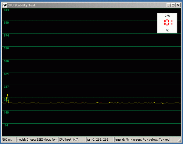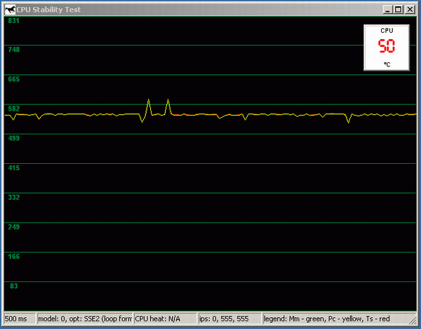 Заметим, что мы отключили в опциях Stability Test самый неточный из всех способов определения производительности Multimedia Timer, оставив только графики Performance Counter и Time Stamp Counter. Если присмотреться, то на скриншоте можно увидеть зеленую линию Multimedia Timer на уровне нуля по оси Y (нуля поскольку он отключен). Также можно заметить, что две линии красная Time Stamp и желтая Performance Counter, практически слились в одну.
