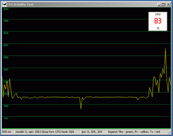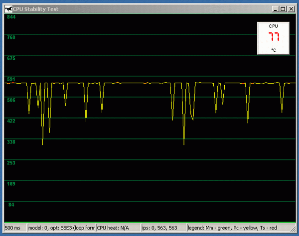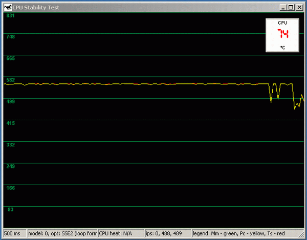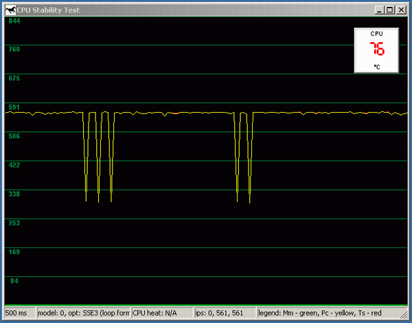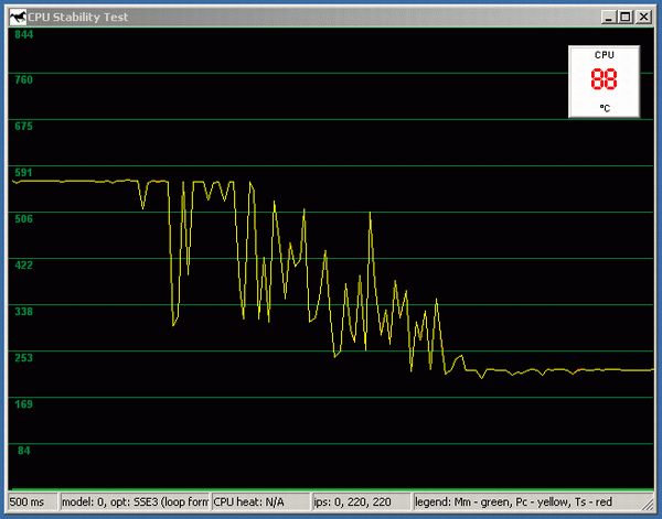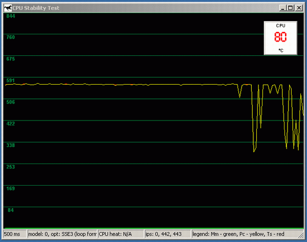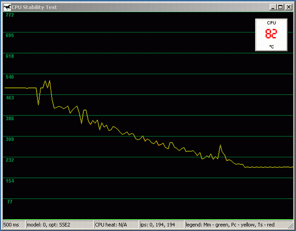 Итак, мы отключаем питание вентилятора. Уже через 5-6 секунд температура возрастает примерно до 80 градусов, и начинается «скачущий троттлинг» производительность то резко падает, то опять столь же резко возвращается к номинальному значению. Совершенно не похоже на более-менее плавное падение, которое мы наблюдали в случае с Northwood. И обратите внимание: если порог между нормальной рабочей температурой и началом троттлинга у Northwood составляет 74/50~=48%, то в случае с Prescott это всего лишь 80/76~=5%.