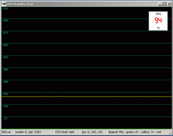 Вот и обещанный апофеоз: пара секунд до полной «смерти» системы, 94 градуса. В нашем случае (22 градуса в помещении, открытый корпус), троттлингу не удалось спасти процессор от перегрева, возник thermtrip, и процессор вместе со всей системой ушел в shutdown. Оставаясь при этом в живых, естественно. И это нельзя назвать случайностью, поскольку мы намеренно доводили наш тестовый стенд до такой ситуации раз 10 подряд. Температура «последнего вздоха» в случае с Pentium 4 3,2 ГГц Northwood колебалась в районе от 94 до 98 градусов по показаниям Motherboard Monitor.