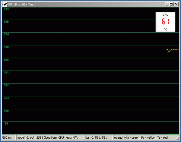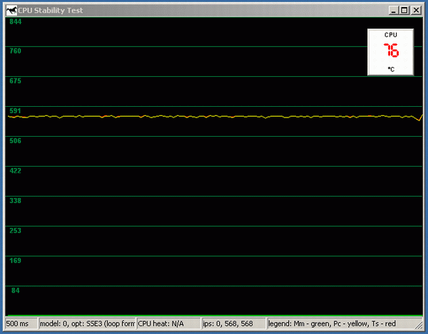 Запущен RightMark CPU Stability Test, время, приблизительно, 5 секунд после старта. Температура выросла на 8 градусов, в окне программы начал отрисовываться график производительности. График условно можно назвать гладким.