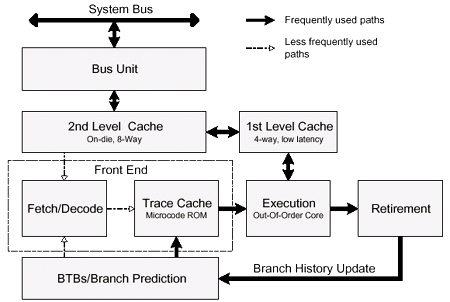 Для обеспечения увеличенного потока микрокоманд и быстрого восстановления конвейера в случае выбора неправильной ветви программы служит Execution Trace Cache — трассирующий кэш команд. Это принципиально новый подход к организации кэша команд первого уровня — кэш находится после дешифраторов и содержит микрокоманды, готовые к исполнению, благодаря чему исключается простой конвейера, вызванный долгой дешифрацией сложных команд. При этом микрокоманды в кэше упорядочиваются в соответствии с несколькими предсказанными ветвями программы, т.е. подряд кэшируется весьма длинный кусок программы — так называемая трасса. Проще говоря, при выполнении заранее упорядоченные в кэше микрокоманды — трассы выбираются подряд, независимо от своих адресов. Благодаря этому обеспечивается увеличенный поток микрокоманд и оптимальное использование пространства кэша, вмещающего около 12 тысяч микрокоманд. А где же быстрое восстановление конвейера? Читаем дальше, скоро все будет…