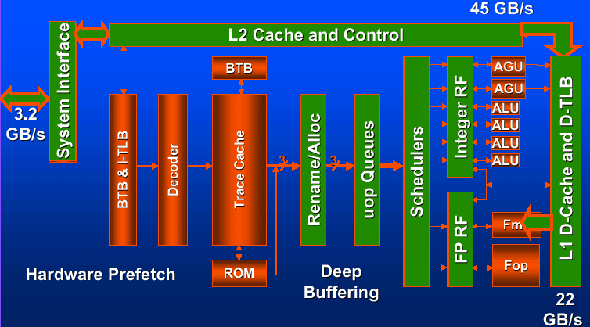 Применена потрясающая Quad-pumped 400 МГц системная шина, обеспечивающая пропускную способность в 3,2 ГБайта в секунду против 133 МГц шины с пропускной способностью 1,06 ГБайт у Pentium III.