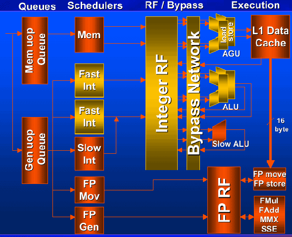 С помощью буфера адреса перехода определяется адрес, указывающий местоположение следующей микрокоманды в трассирующем кэше (TC Nxt IP). Затем происходит выборка микрокоманд из трассирующего кэша (TC Fetch) и передача (Drive) в распределитель/таблицу псевдонимов регистров (RAT — register alias table). Распределяются ресурсы, необходимые для выполнения — буферы загрузки, буферы сохранения и т.д. (Alloc) и осуществляется отображение логических регистров на физическое регистровое пространство (Rename). Микрооперации помещаются в очередь (Queue), где содержатся до тех пор, пока не появится место в планировщиках (Schedulers). В планировщиках выполняется разрешение взаимозависимостей (dependencies) микрокоманд, которые затем передаются в регистровые файлы (register files) соответствующих блоков выполнения (Dispatch). Происходит выполнение микрокоманды (Execute), а также вычисление флагов (Flags). При исполнении команды перехода происходит сравнение реального адреса перехода и предсказанного (Branch Check) и передача