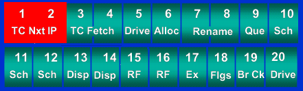 По аналогии с семейством P6, конвейер делится на три самостоятельных функциональных блока — входной блок упорядоченной обработки (in-order front end), отвечающий за декодирование и обработку команд, ядро исполнения с изменением последовательности (out-of-order core), где, собственно, и происходит выполнение команд, и конвейер упорядоченного вывода команд из последовательности (in-order retirement). Вот схема конвейера, состоящего из 20 ступеней: