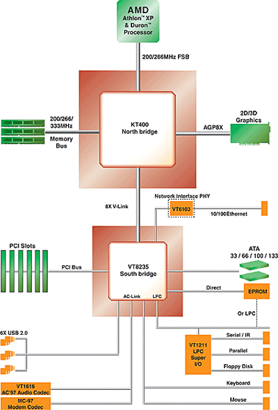 Второе по значимости (с инженерной точки зрения) нововведение  новая шина 8X V-Link между северным и южным мостом, обеспечивающая пропускную способность 533 МБ/с. Многие из нас ждали 8X V-Link еще в KT333, однако VIA, видимо, решила совместить два «8X» в одном чипсете :). Таким образом, VIA Technologies догнала Intel (в последних наборах микросхем этой компании используется внутричипсетная шина с такой же пропускной способностью), и обе они по-прежнему отстают от SiS, которая уже довольно давно сделала 1,2 ГБ/с MuTIOL и сидит на нем, как собака на сене, гордясь самой быстрой внутричипсетной шиной во всем x86-королевстве. :)