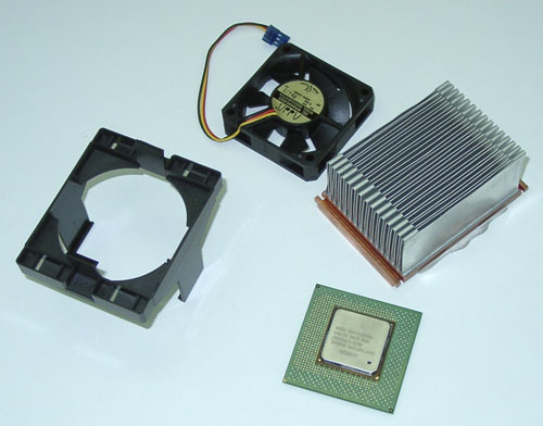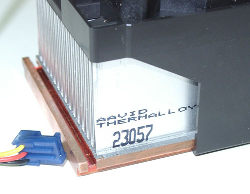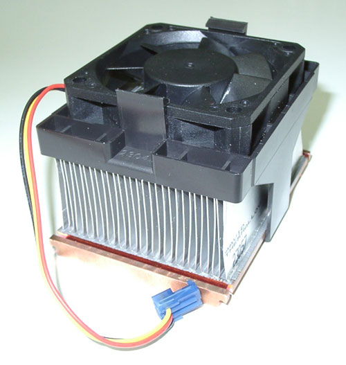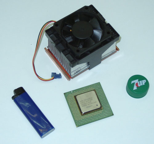К вопросу охлаждения горячего Willamette привлекли некогда культовую в области охлаждения компанию AAVID, которая в последнее время несколько затерялась в условиях жесткой конкуренции. Но нет, AAVID жив, что и доказывает этим сплавом цветных металлов размером с кирпич и весом с автомобильный аккумулятор. А если серьезно, вес невиданного монстра — около пятисот грамм, а размер будет нетрудно представить, сравнив его с обычной зажигалкой и пробкой от бутылки 7UP. Нижняя часть, прилегающая к процессору, для повышения теплопроводности, сделана из меди, и представляет собой пластину толщиной примерно миллиметров 7, а сверху к ней припаяны ребра из алюминия.
