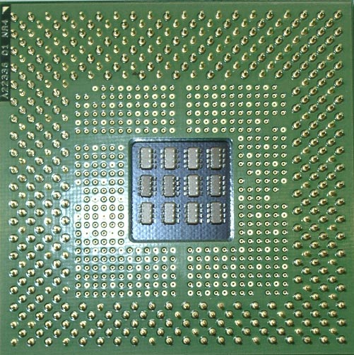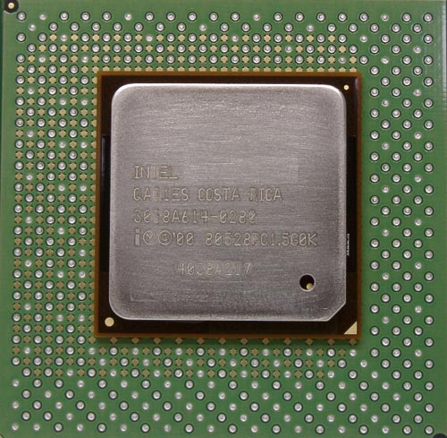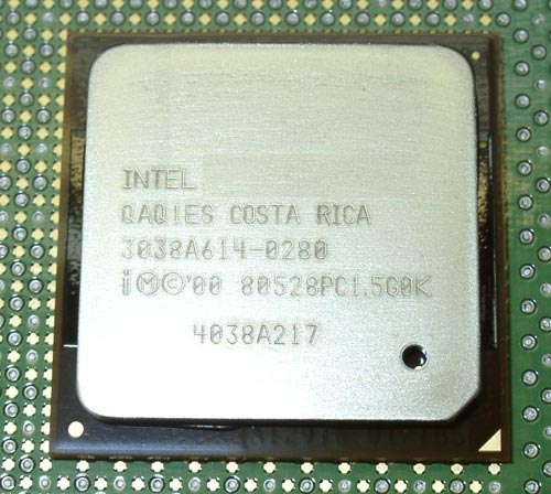 А вот и само ядро, благоразумно упрятанное под железную крышку. Первой причиной, скорее всего, послужило нежелание Intel возиться с поломанными кристаллами, благо печальный опыт конкурента налицо, а вот вторая причина, видимо в нежелании демонстрировать истинный размер ядра. На маркировке процессора — полтора гигагерца. Этот процессор выступил "фотомоделью" и до сего дня еще ни разу не удосужился поработать по прямому назначению — хотя есть надежда исправить ситуацию в самое ближайшее время. А второй "трудяга", с которого сняты результаты тестов, еще предстанет перед нами, хотя и густо перемазанный пастой.