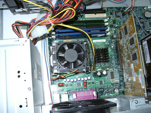 Весьма удачное решение — на медно-алюминиевый радиатор защелкивается держатель, а в него вставляется вентилятор. Для такого радиатора — явно маловат! Но никто же не мешает доработать держатель, чтобы в него поместился кулер от серверного корпуса — охлаждать, так охлаждать… Именно такой, какой стоит на задней стенке нашей системы — вот такой: