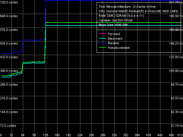 Кривые псевдослучайного и случайного обхода сохраняются на почти постоянном уровне, т.е. эффективность алгоритма Hardware Prefetch не изменяется при увеличении разгрузки Bus Interface Unit (BIU) процессора. В отличие от кривых прямого и обратного линейного обхода памяти, где разгрузка шины явно увеличивает эффективность Hardware Prefetch. На основании анализа этих данных в свое время был сделан вывод о том, что измерение латентности памяти данным образом (используя данные псевдослучайного обхода) можно считать вполне адекватным.