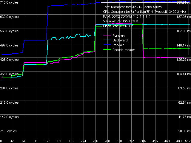Вот мы и подходим к другому заданному выше вопросу «зачем». Какие результаты следует считать более «правильными» с аппаратной предвыборкой, или без таковой? Иными словами, нужно ли отключать Hardware Prefetch на время измерения? Ответ на этот вопрос будет предельно прост: все зависит от того, что мы хотим измерить. Если нам требуется оценить реальные задержки при чтении процессором данных из памяти в одной из моделируемых тестом ситуаций прямого, обратного, случайного или псевдослучайного обхода блока памяти (первые две из которых соответствуют кодированию видео или какой-либо другой потоковой обработке данных, а две последних например, поиску в базе данных) то следует остановиться на первом варианте. Именно этот вариант будет отражать действительность, т.е. стандартный режим работы процессора: Hardware Prefetch включен, а считывание данных из памяти осуществляется по 128-байтным секторам, составляющим две строки кэша процессора. Резюмируя, первый метод позволяет нам оценить реальную латентность подсистемы памяти в целом, т.е. включая функциональные блоки процессора, ответственные за обмен данными с оперативной памятью.