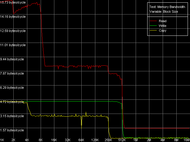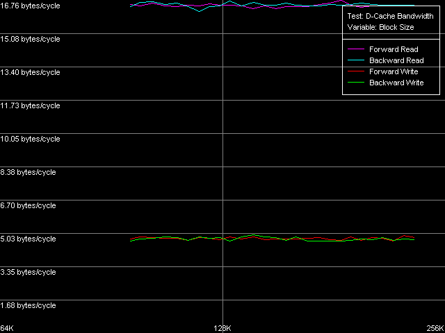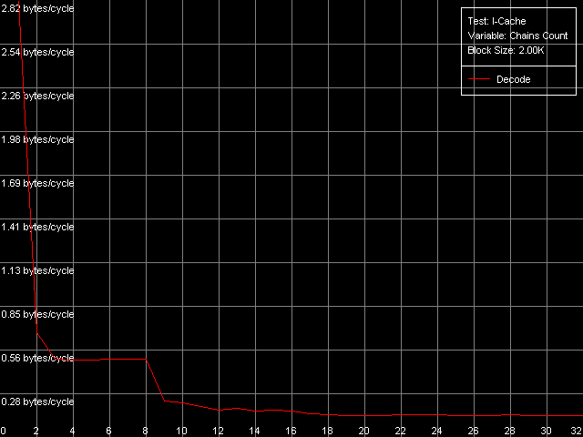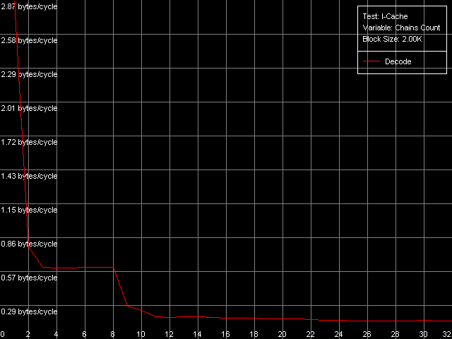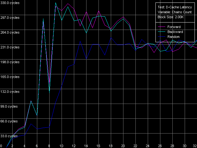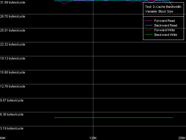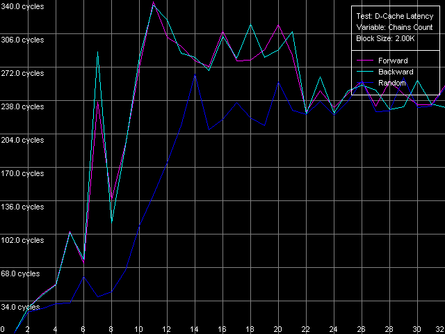Без сюрпризов со стороны Prescott нам, конечно, не обойтись. На этот раз это обработка зависимых команд, вроде LEA/MOV/ADD/OR. Как видно из таблицы, они ведут себя одинаково и исполняются со скоростью всего-навсего 1 операция/такт (кстати, напомним, что то, что OR ведет себя именно так, мы выяснили еще в тесте минимальной латентности L2/RAM). Именно поэтому здесь мы даже не смогли оценить эффективную границу Trace Cache, ибо их скорость исполнения как из L1i, так и из L2 одинакова 2 байта/такт.