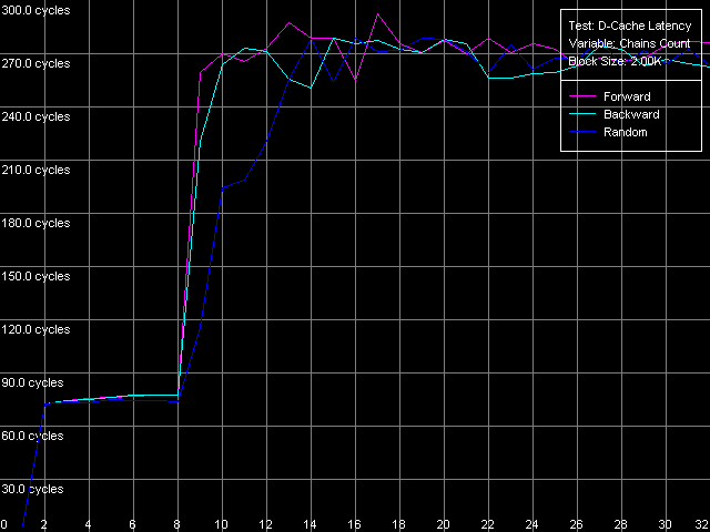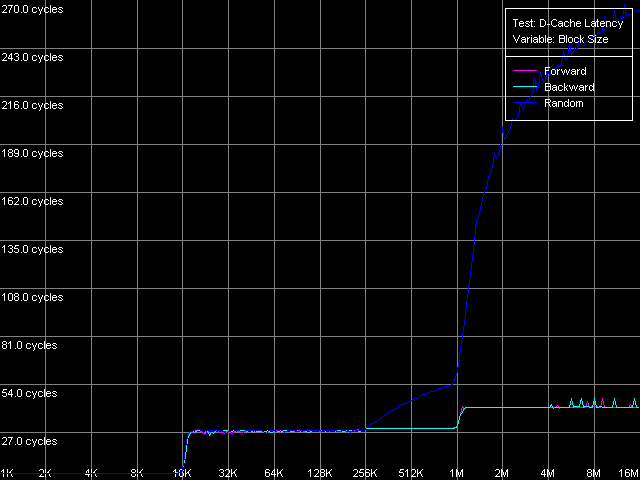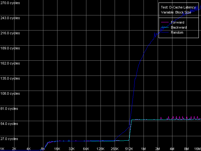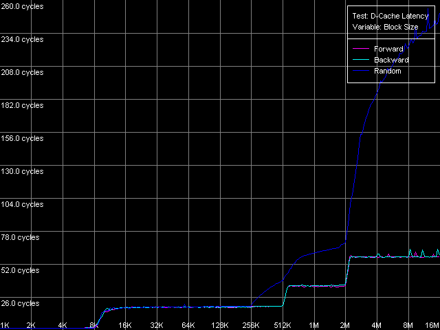 Как видно из этой таблицы, серьезных различий между Northwood и Gallatin в плане латентности не наблюдается. Латентность L1 во всех случаях доступа составляет ровно 2 такта, латентность L2 в среднем 18.5 тактов. Латентность кэша L3 процессора Pentium 4 XE при прямом и обратном доступе почти в два раза выше, чем латентность L2 она составляет 35.5 тактов (а при случайном доступе и того выше, 61 такт процессора, правда, с упомянутой выше оговоркой, что точное измерение последней не представляется возможным ввиду исчерпания D-TLB процессора). Наконец, латентность последнего уровня оперативной памяти характеризуется величинами 57-58 тактов (17.6-18.0 нс) при прямом/обратном доступе, что говорит о наличии хорошего алгоритма Hardware Prefetch, работающего в этих режимах обхода. Латентность случайного доступа в RAM (с той же оговоркой) существенно выше, она составляет 229 тактов (71.0 нс) на Northwood и 185 тактов (57.0 нс) на Gallatin. Меньшую величину латентности памяти на последнем можно отнести разве что к наличию кэша данных третьего уровня, объем которого позволяет покрыть до 50% обращений к памяти в рассматриваемом случае.