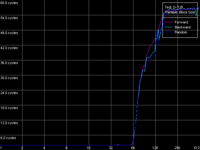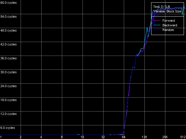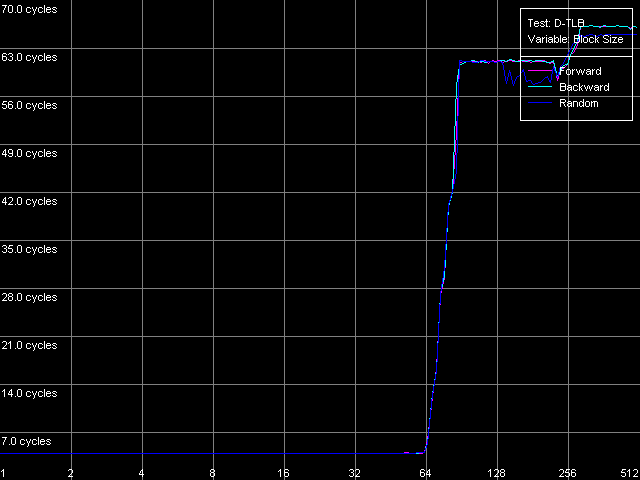 Наше предположение относительно размера и структуры D-TLB подтверждается для всех трех процессоров: он одноуровневый, и размер этого единственного уровня D-TLB равен 64 записям (дескрипторам страниц памяти). Что является более потрясающим фактом, так это то, насколько же дорого обходится (с точки зрения количества тактов процессора) промах D-TLB. Действительно, латентность доступа в L1 кэш в условиях промаха D-TLB составляет порядка 57 тактов (Northwood, Gallatin) и 60-67 тактов на Prescott. Аналогичная картина на процессорах семейства AMD K7/K8, даже в случае промаха L2 D-TLB, куда лучше латентность доступа в L1 в этих условиях не превышает 30-36 тактов процессора.
