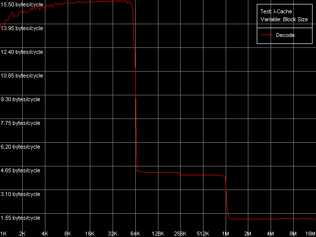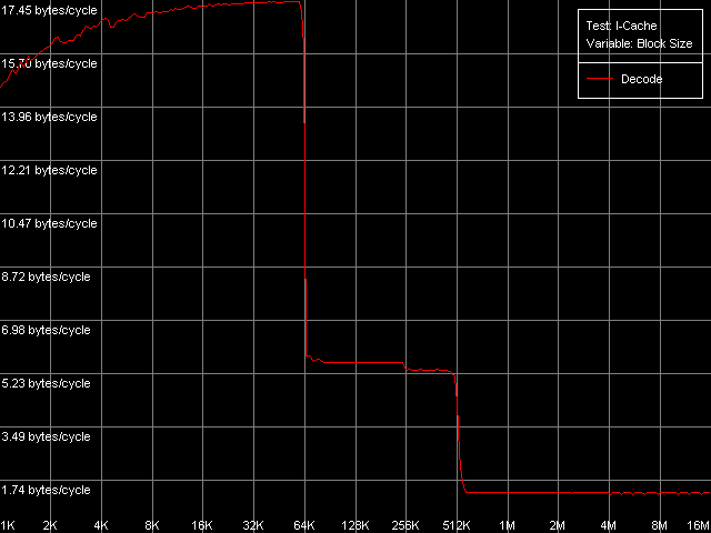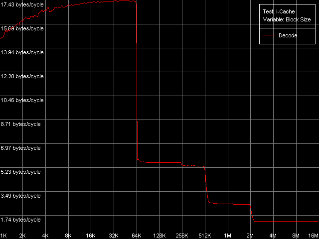 Легко заметить, что объем Trace Cache во всех случаях, в пересчете на количество микроопераций, реально не превышает величину 11000 uop, что позволяет предположить наличие некоторого резерва в одну тысячу микроопераций, отводящегося под служебные нужды. Максимальная скорость исполнения простых команд из Trace Cache достигает 2.9 операций/такт. При этом видно, что она лимитируется именно исполнительным блоком процессора (предельная скорость работы которого 3 микрооперации/такт), а не скоростью «подкачки» инструкций из Trace Cache, в пересчете на размер x86 команд (скорость исполнения достигает 17.44 байт/такт и выше). По этому показателю процессоры семейства Pentium 4 выгодно отличаются от рассмотренных нами ранее AMD K7/K8, где скорость исполнения больших x86 команд лимитировалась именно скоростью «подкачки» инструкций из L1i в исполнительный блок процессора (не более 16 байт/такт).