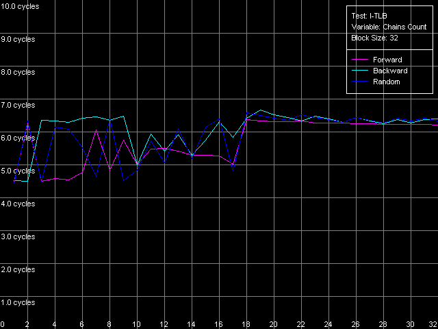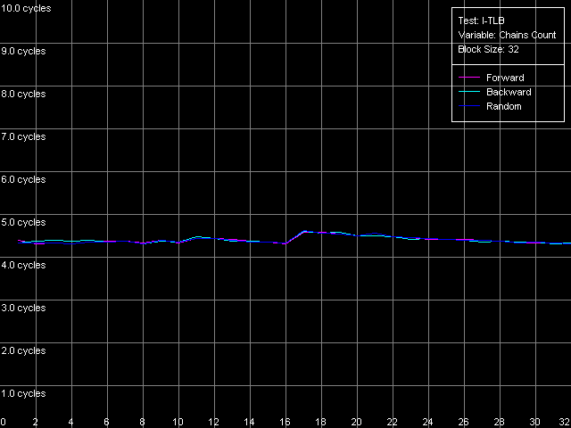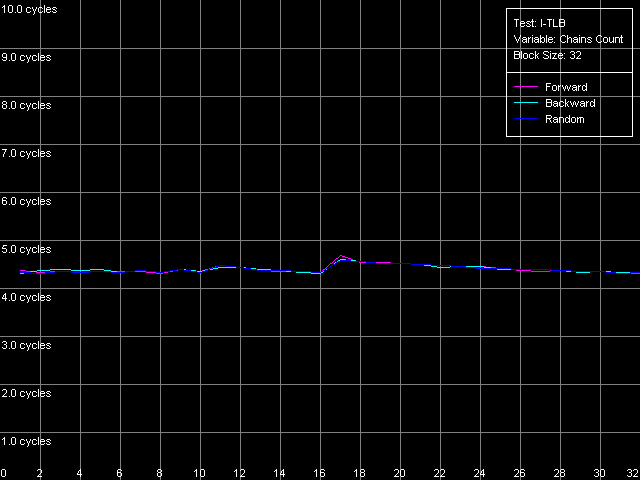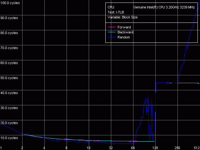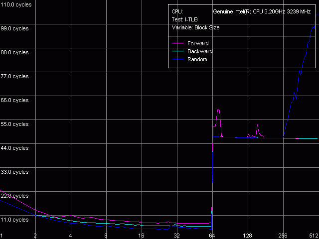 Мы решили проверить, так ли это на самом деле, для чего запустили реализованный в RMMA v2.5 тест I-TLB (пресет I-TLB Size). Результаты теста на Northwood и Prescott оказались одинаковыми ниже мы приводим картинки, полученные на последнем.