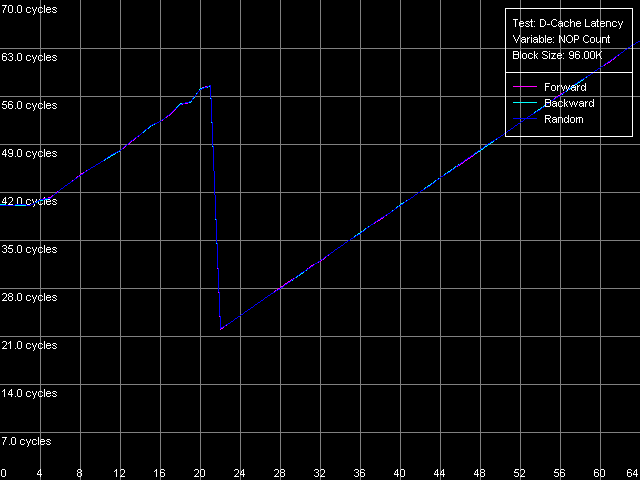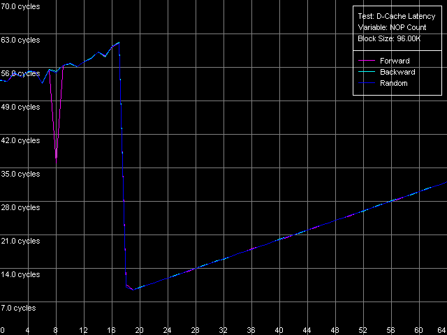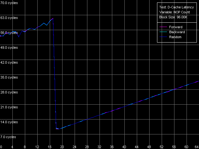 Минимальная латентность L3 при прямом и обратном последовательном доступе достигается столь же легко, уже при вставке 20 «пустых» операций, и составляет 20 тактов процессора (некоторое ее снижение до 17 тактов при вставке 53-58 «NOP»-ов остается не очень понятным). Минимальная латентность случайного доступа в L3 намного больше (причина этого уже обсуждалась выше) в нашем тесте она составила 52.7 тактов, что все же меньше, чем ее среднее значение.
