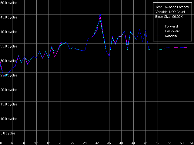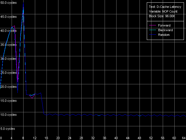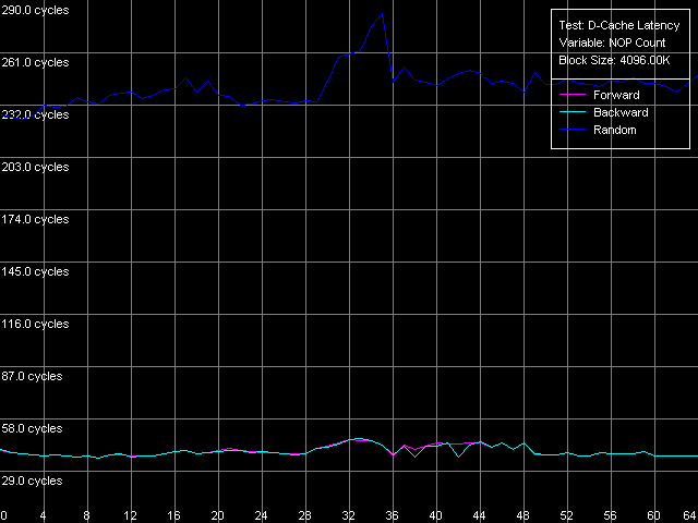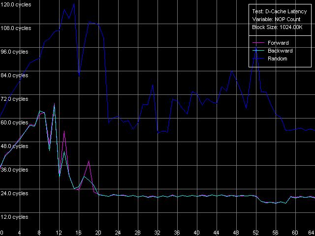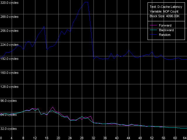 И снова Northwood и Gallatin ведут себя вполне адекватно. Минимальная латентность L2 9 тактов, как и положено, и наблюдается она при вставке 18 «NOP»-ов (что в точности соответствует 9 тактам процессора, как и положено в данной методике тестирования). Картина на Prescott, хотя и не принципиально, но иная. Минимум составляет 22 такта, и наблюдается он при 22 «NOP»-ах (а поскольку каждый из них отнимает 1 такт процессора, значит, 22 такта и получается). Так и запишем минимальная латентность L2 у Prescott 22 такта, и ничего больше не скажешь.