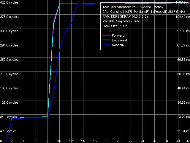 Количественные характеристики латентности первого и второго уровней кэша одинаковы для всех рассмотренных в таблице процессоров. Кстати, латентность L1 в 4 такта на Pentium 4 EE 3.73 можно считать первым экспериментальным подтверждением того факта, что этот процессор действительно основан на ядре Prescott (все предыдущие Pentium 4 Extreme Edition, как известно, были основаны на ядре Gallatin, латентность L1 кэша которого составляла 2 такта).