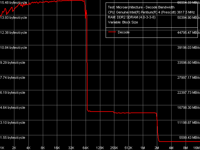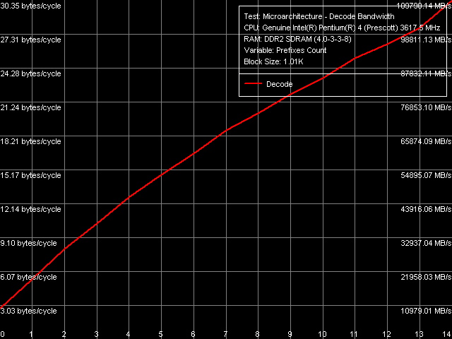 В этом плане, в новой ревизии ядер Prescott с EM64T если что-то и изменилось, то весьма незначительно: снижение темпа исполнения «префиксных» NOP-ов по мере увеличения количества префиксов, наблюдающееся на новых Prescott, практически совпадает с наблюдаемым ранее на ядре Nocona (за исключением одной дополнительной, хорошо воспроизводимой «просадки» при наличии 13 префиксов перед инструкцией NOP). Таким образом, вывод, сделанный ранее относительно первого «64-разрядного» ядра Nocona, распространяется и на случай новой «64-разрядной» ревизии ядра Prescott: отбрасывание лишних префиксов, что является функцией декодера x86-инструкций, находящегося перед Trace Cache, отныне протекает менее эффективно. Разумно предположить, что это касается не только префиксов, но и эффективности функционирования декодера в целом.
