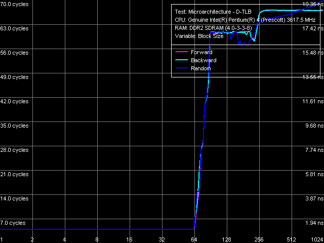 Ассоциативность I-TLB, Pentium 4 660 и Pentium 4 EE 3.73Объем I-TLB 64 записи (напомним, что этот ресурс при включении технологии Hyper-Threading разделяется пополам между логическими процессорами), штраф промаха буфера 45 тактов (прямой, обратный обход) и более (случайный обход), ассоциативность полная.