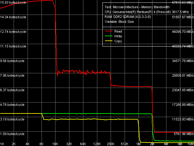 Переходим к результатам тестов новых процессоров, полученных в тестовом пакете RMMA. Общая картина реальной пропускной способности уровней подсистемы памяти (L1/L2/RAM) на Pentium 4 660 и Pentium 4 EE 3.73 выглядит одинаково.