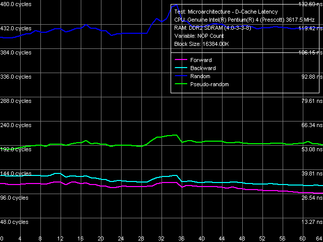 Следует вновь отметить снижение латентности доступа в оперативную память (по сравнению с исследованной ранее платформой Pentium 4), практически незаметную при прямом и обратном обходе, и максимальную (20-25 нс) при случайном обходе. Заметим, что величины минимальной латентности доступа в память практически не отличаются от «средних» величин, полученных в предыдущем тесте, за исключением разве что прямого и обратного режимов обхода, в которых алгоритм аппаратной предвыборки получает дополнительное преимущество от разгрузки шины L2-RAM (BIU). Разумеется, подобное утверждение не распространяется на случай измерений при отключенном алгоритме Hardware Prefetch.