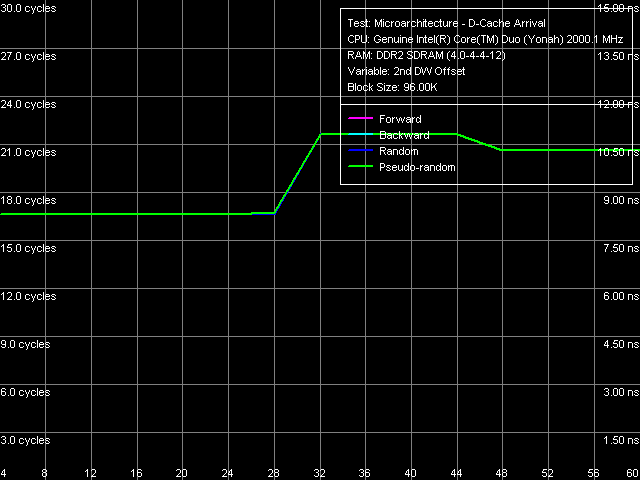 Что касается разрядности шины данных L1-L2 кэша, она по-прежнему остается равной 128, что наглядно демонстрируется тестом прибытия данных по указанной шине (рис. 10) запрашиваемая 64-байтная строка кэша «не успевает» прибыть по шине L1-L2 за 3 такта обращения к L1-кэшу, в связи с чем возникают дополнительные задержки при чтении второго элемента данных, отстоящего от первого на 32 байта или выше.