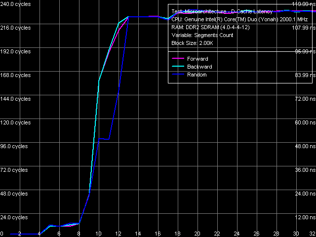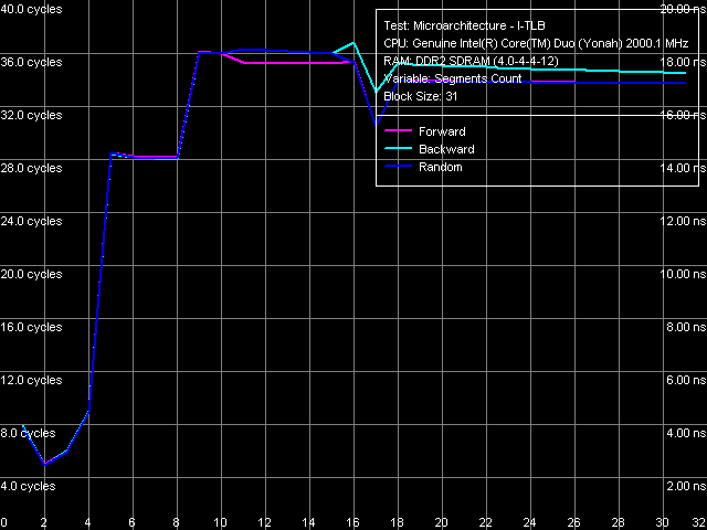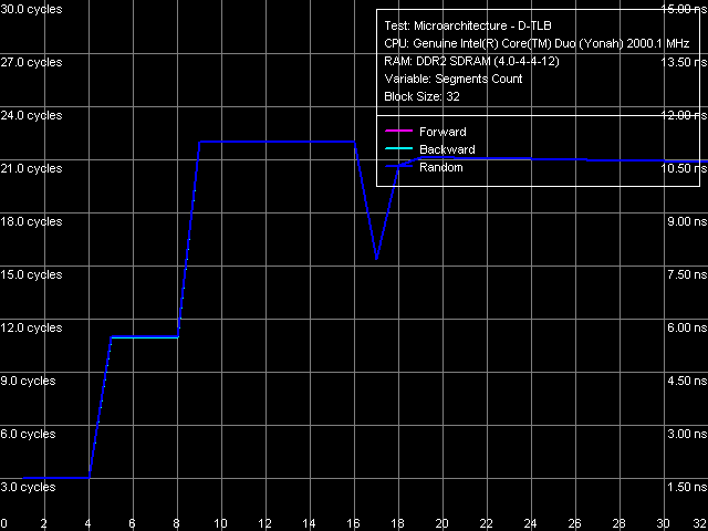 Картина ассоциативности D-TLB (рис. 16), характеризующаяся двумя довольно резкими скачками (что гораздо более типично для двухуровневых TLB, каждый уровень которого имеет разную ассоциативность), наблюдалась и ранее на второй ревизии ядра Dothan, более ранние ревизии Pentium M характеризовались стандартными кривыми с единственным перегибом в области 4 сегментов, соответствующим истинной ассоциативности D-TLB процессоров этого семейства.