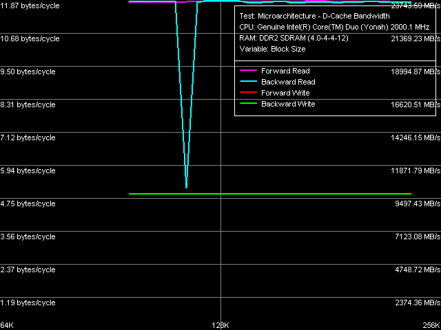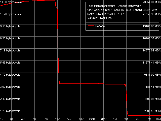 Что касается «префиксных» инструкций CMP 6-байтных операций сравнения, содержащих перед собой два однобайтовых «бессмысленных» префикса, существенных изменений в Yonah по отношению к ним не наблюдается. Предельная скорость исполнения таких инструкций по-прежнему составляет 4 такта на инструкцию, тем не менее, можно отметить слегка возросшую скорость их исполнения из L2-кэша на фоне некоторого снижения его эффективности в целом.