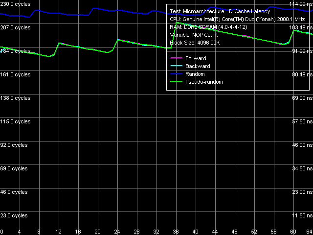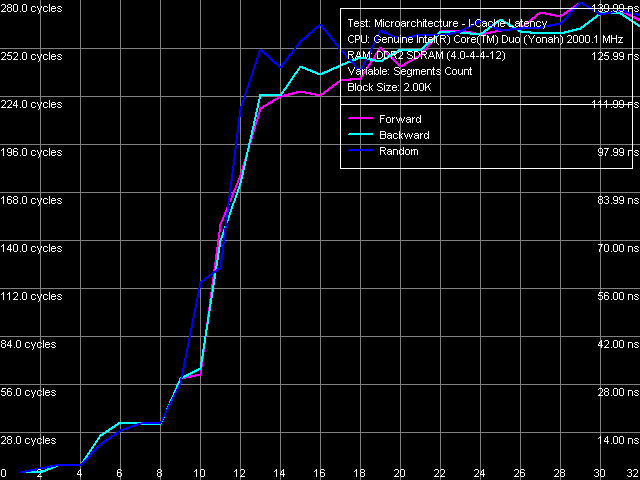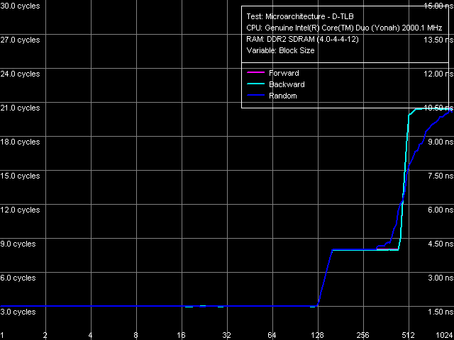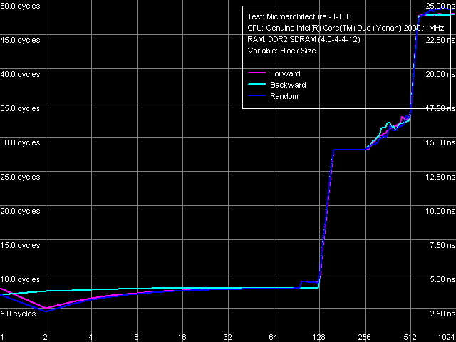 Одинаковый вид всех четырех кривых (размера и ассоциативности D-TLB и I-TLB), полученных на процессорах Core Duo (Yonah) и Pentium M (Dothan rev. C0) указывает на одинаковую организацию этих ресурсов у данных процессоров.